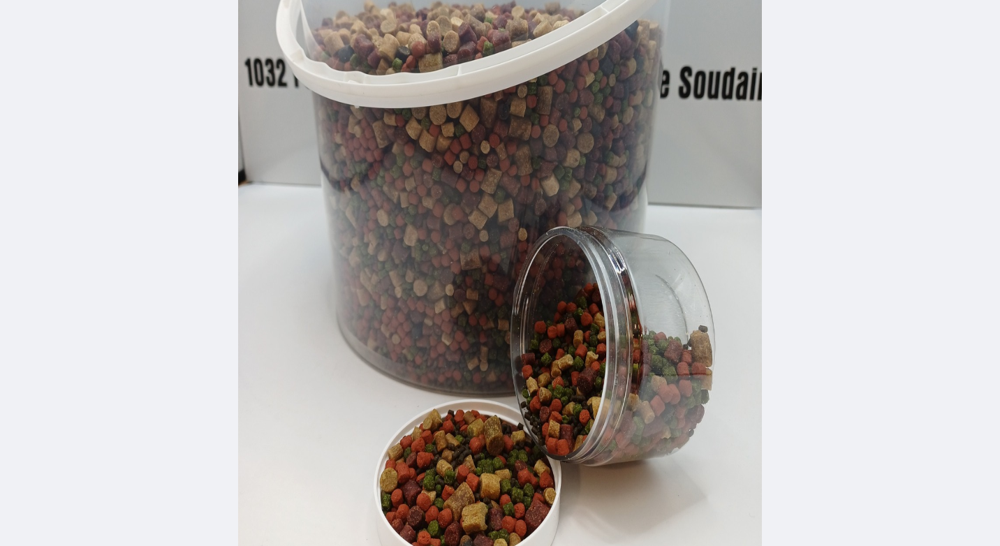Mélange de différentes tailles et couleurs de pellets.